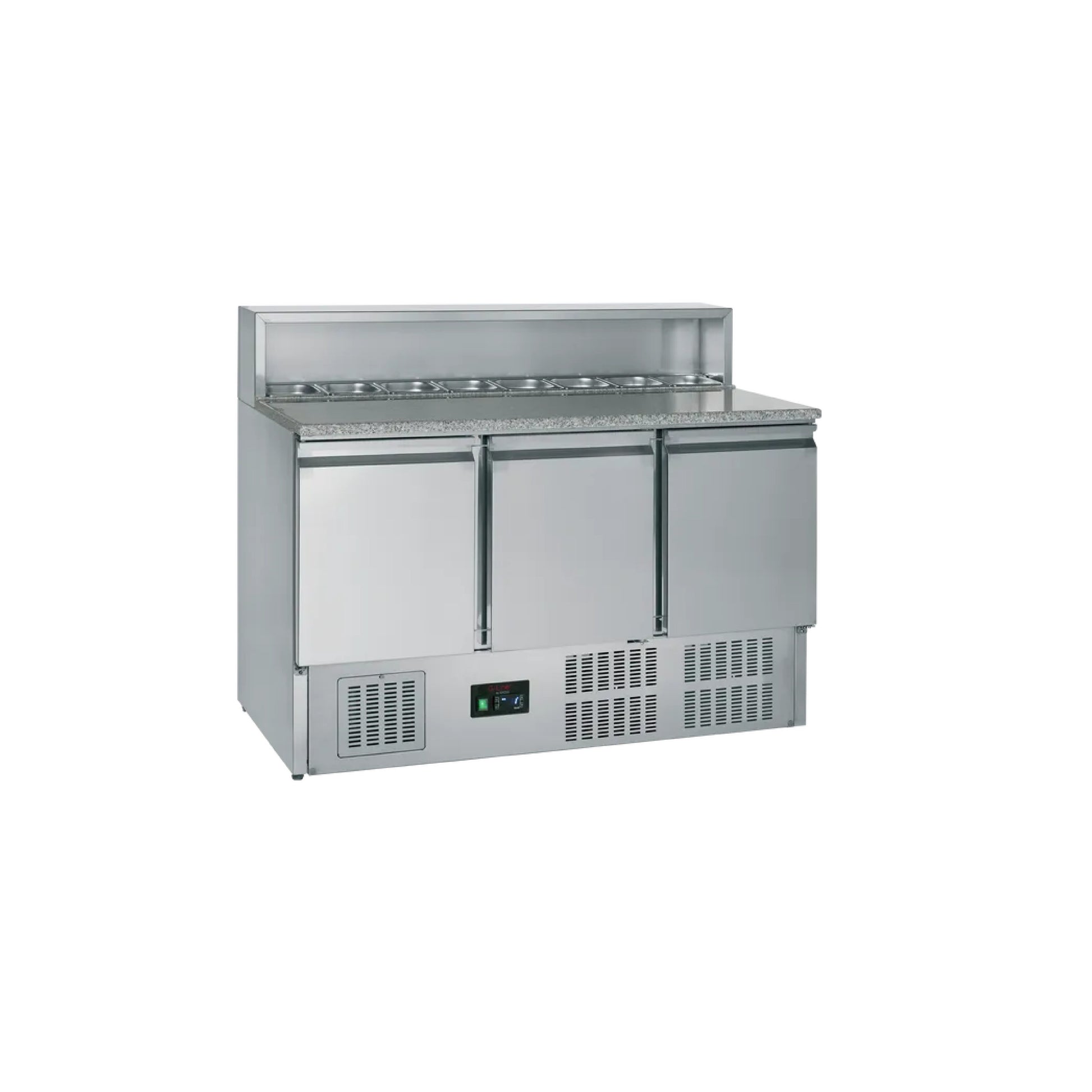 Made entirely of stainless steel. Granite worktop. Ventilated cooling. Digital thermostat. Automatic condensation evaporation. Height-adjustable feet.