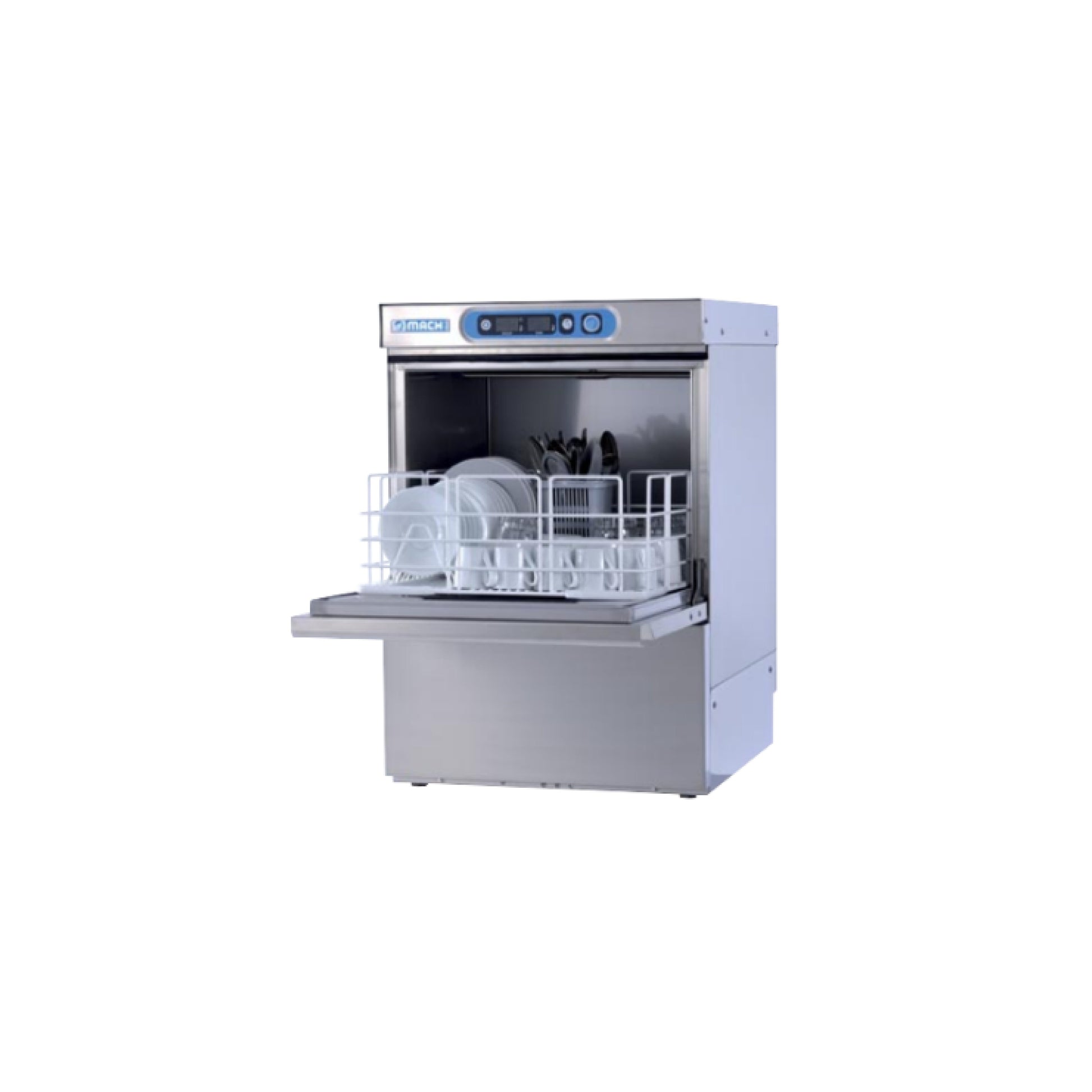 Undercounter dishwasher for washing glasses and goblets. The structure is made of easy-to-clean stainless steel, with a tank with rounded corners and a balanced door. A high-performance machine with improved sound insulation and higher performance, with a magnetic microswitch to stop the operation when the door is open.