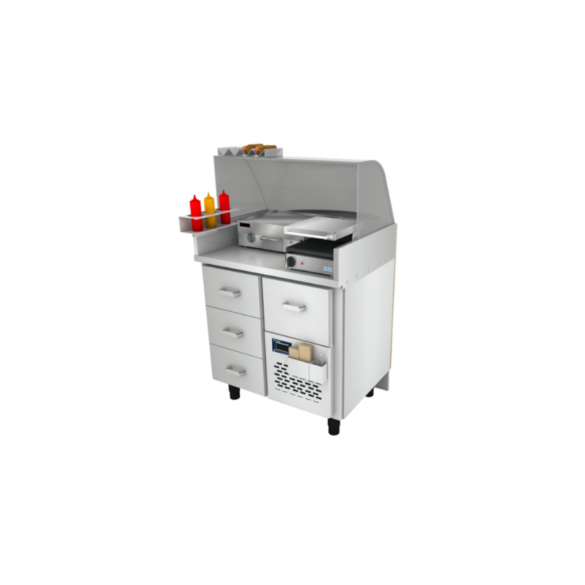 Neli sahtlit mahutavad GN nõud (3 tk GN1/1-150. 1 tk GN1/1-200). Seadme kõrgust saab muuta reguleeritavatest jalgadest 874-932 mm.